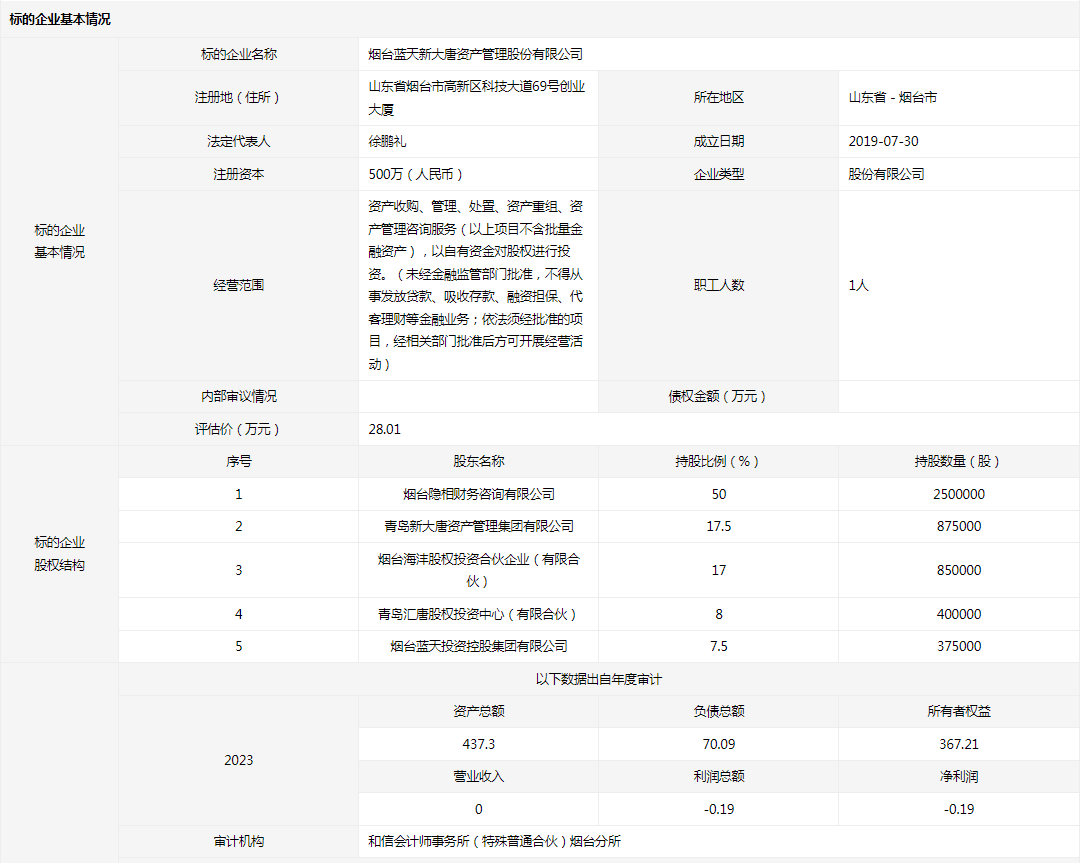 煙臺(tái)藍(lán)天新大唐資產(chǎn)管理股份有限公司7.5%股權(quán)(37.5萬(wàn)股股份)
