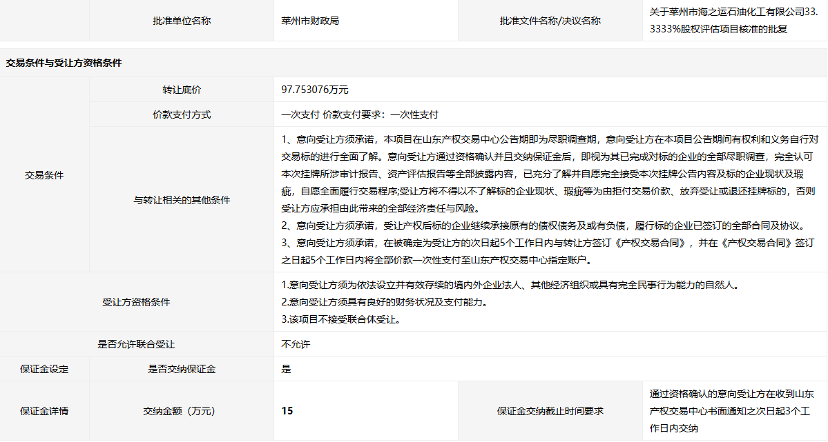 萊州市海之運石油化工有限公司33.3333%國有股權(quán)