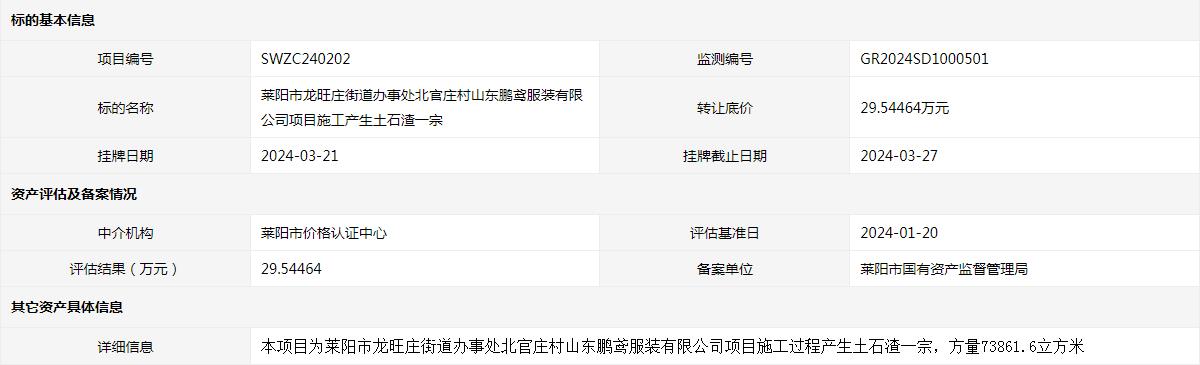 萊陽市龍旺莊街道辦事處北官莊村山東鵬鳶服裝有限公司項(xiàng)目施工產(chǎn)生土石渣一宗