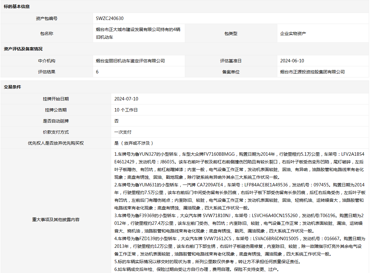 煙臺市正大城市建設(shè)發(fā)展有限公司持有的4輛舊機動車